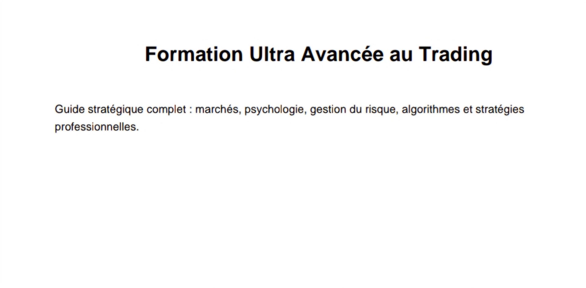 Cette formation ultra avancée en trading a été conçue pour celles et ceux qui veulent arrêter de trader au hasard et commencer à agir comme de véritables professionnels des marchés financiers. À travers un programme structuré et complet, tu vas apprendre des stratégies avancées utilisées par les traders expérimentés pour analyser les marchés, identifier les meilleures opportunités et gérer ton capital de manière intelligente.
